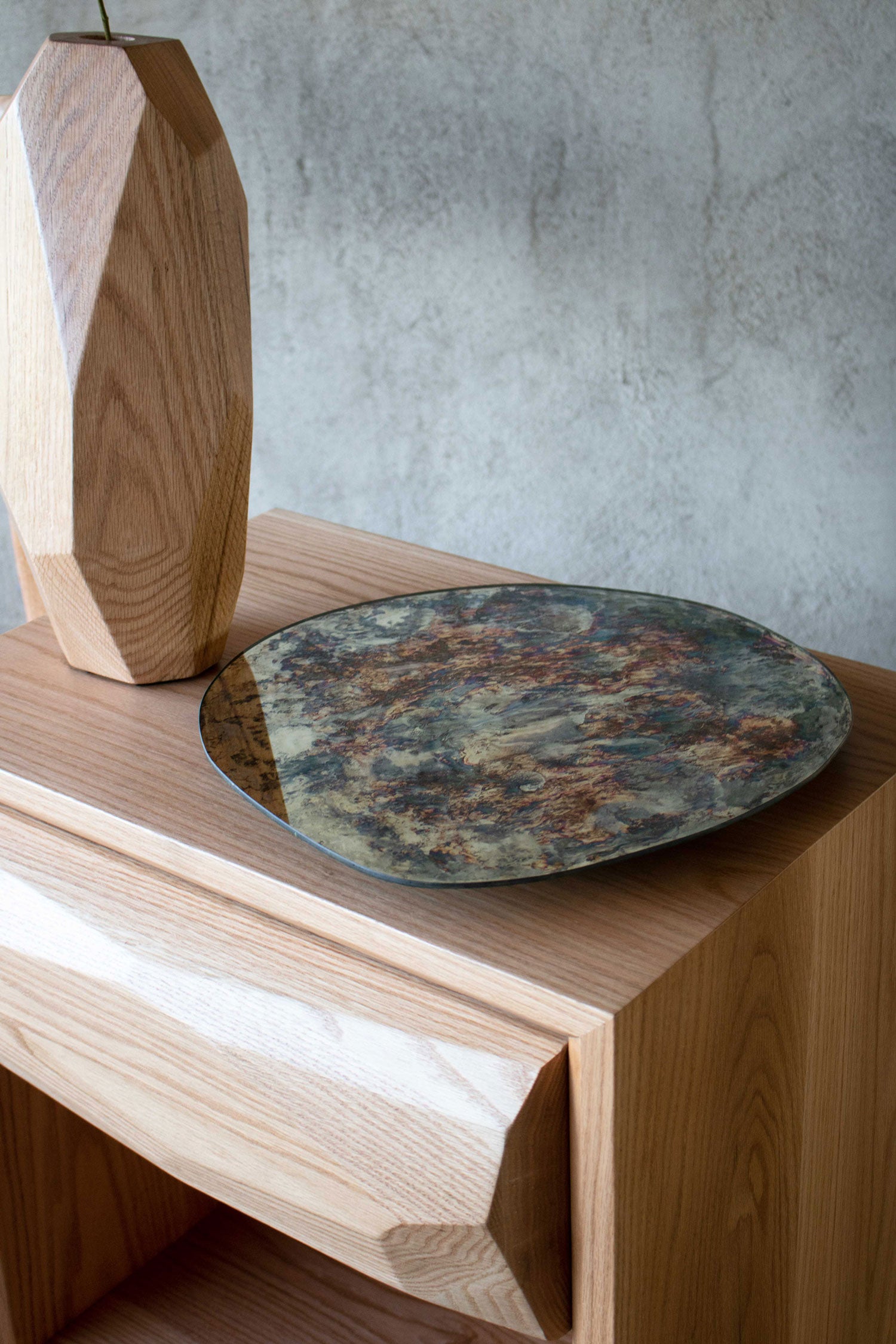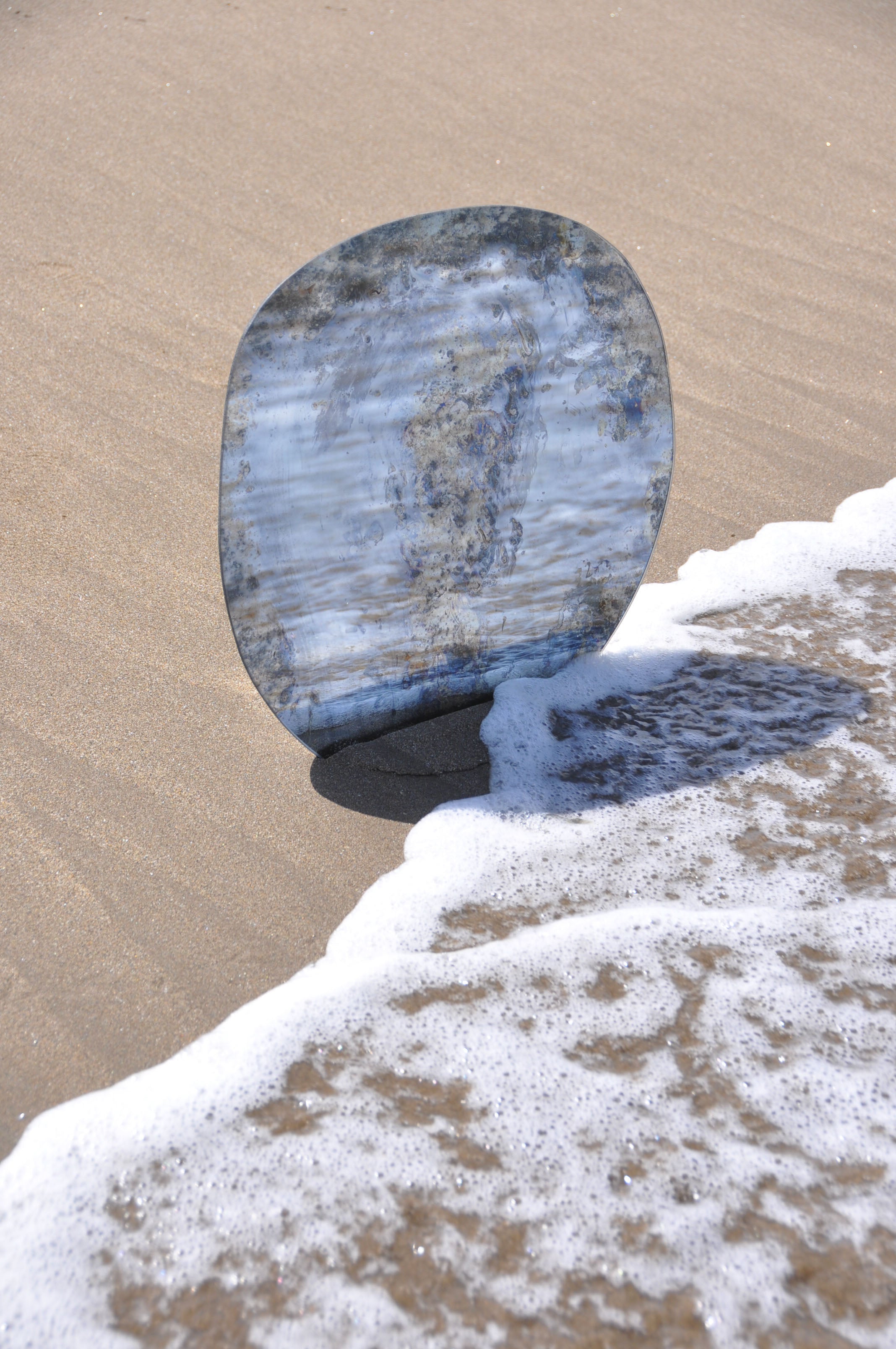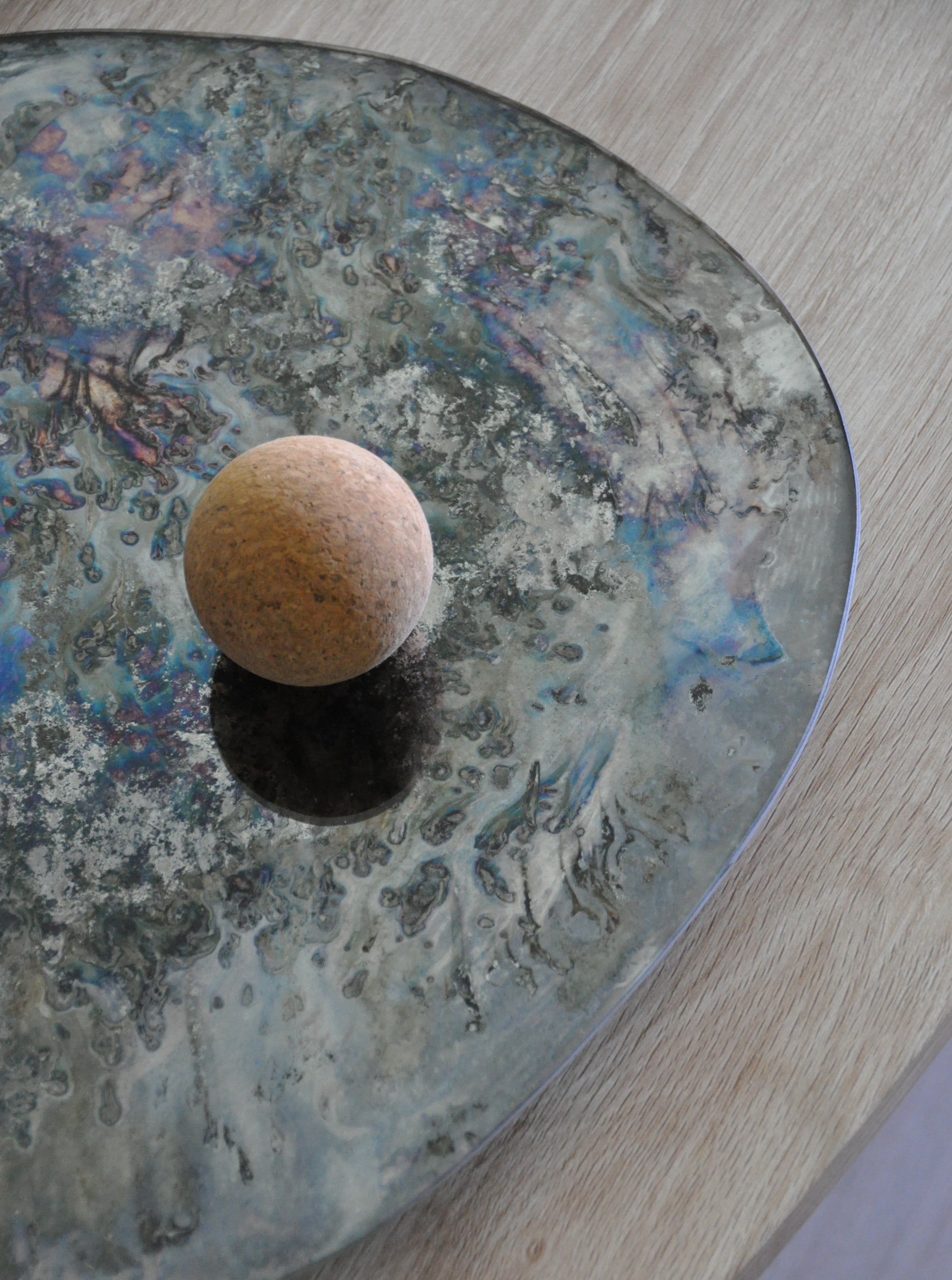 Tamaño: 38 x 38 cm. Cristal con tratamiento químicos elaborado de forma artesanal, con bordes pulido y sellados. Posee anclajes en aluminio en su reverso que le permiten orientarlo en dos posiciones. Su tratamiento permite reflejarse completamente. No se aconseja para decoración al exterior (aire libre). Cada pieza queda única en su tratamiento; color y tipo de mancha.