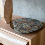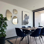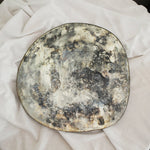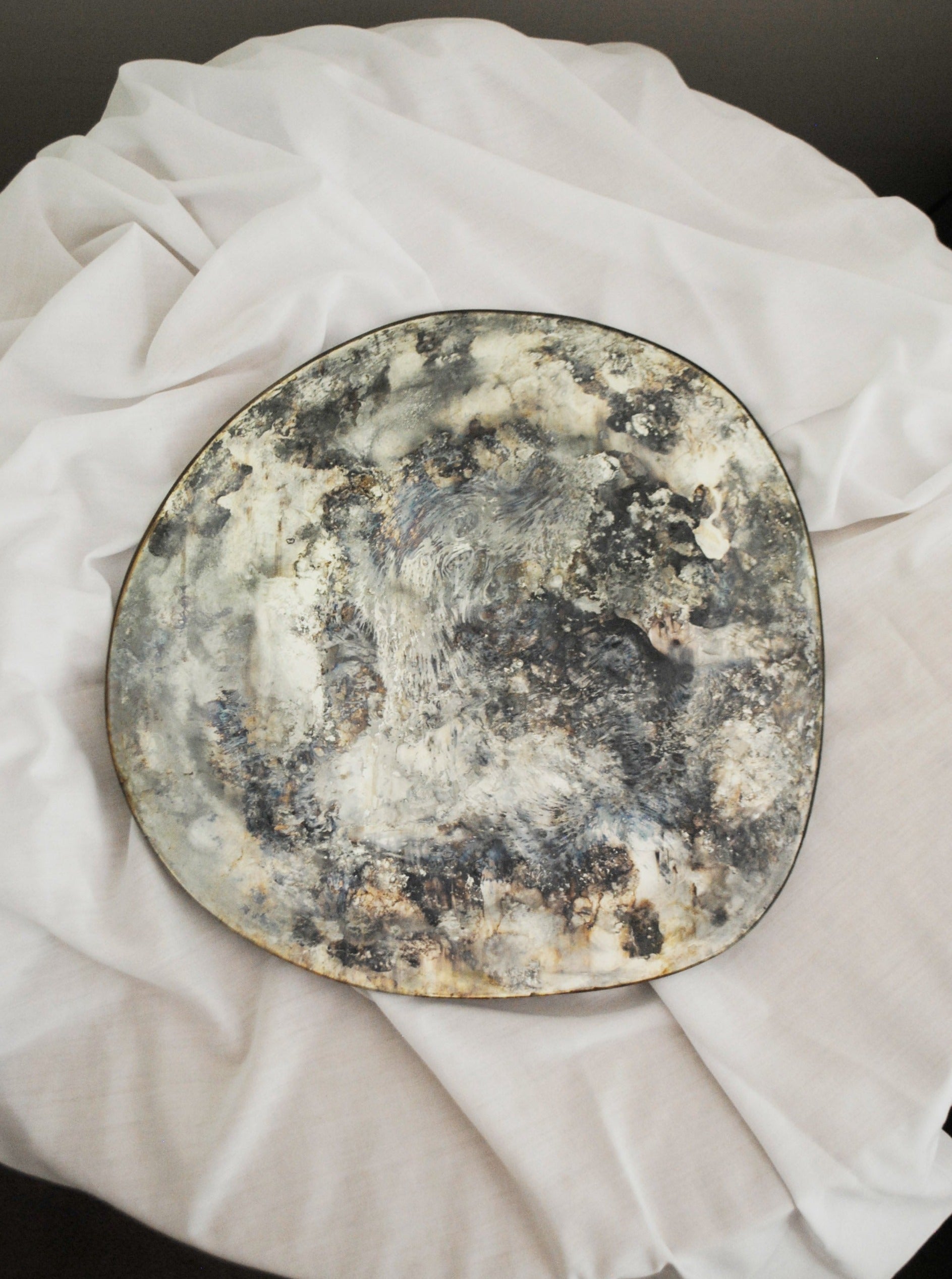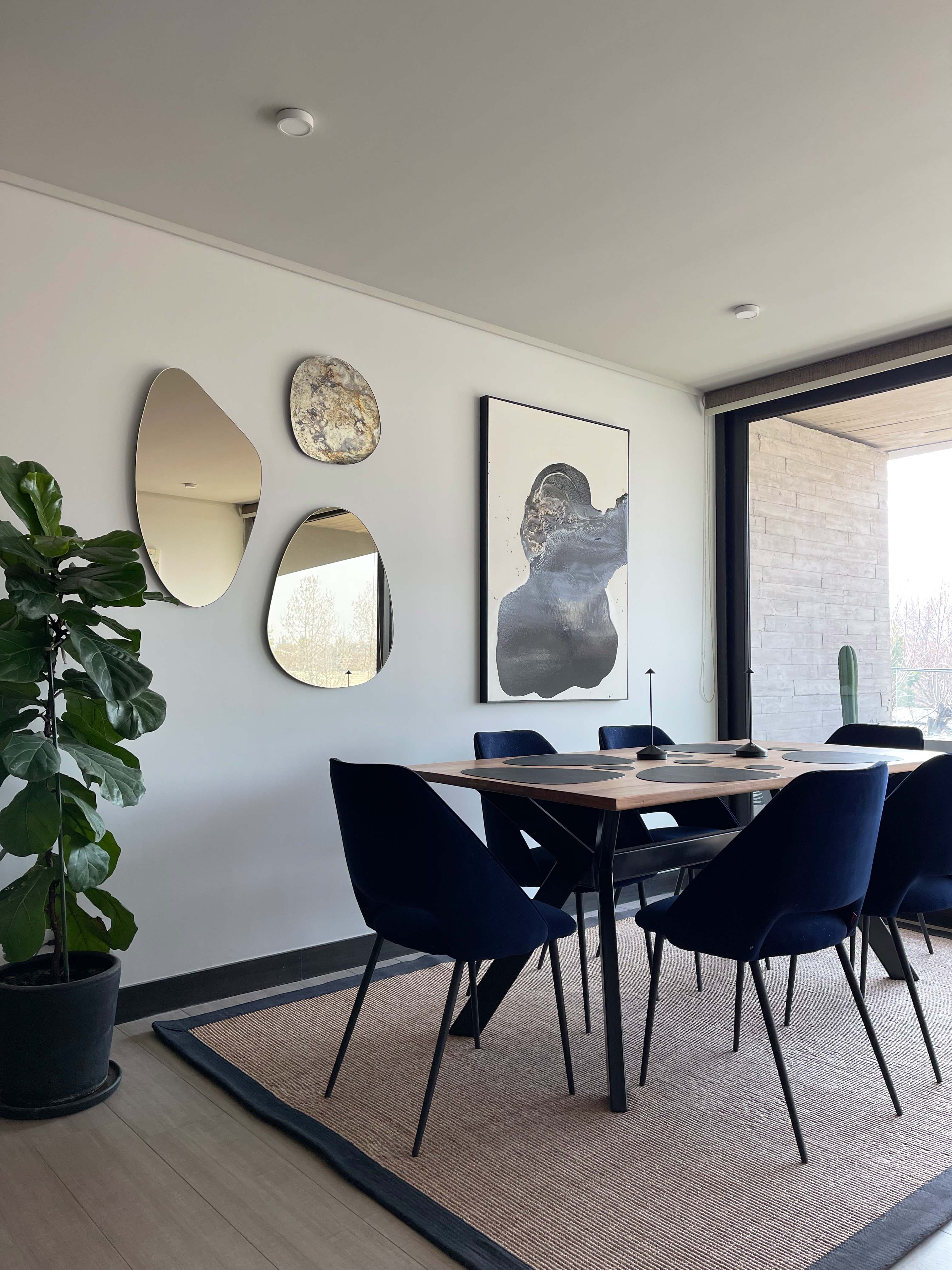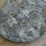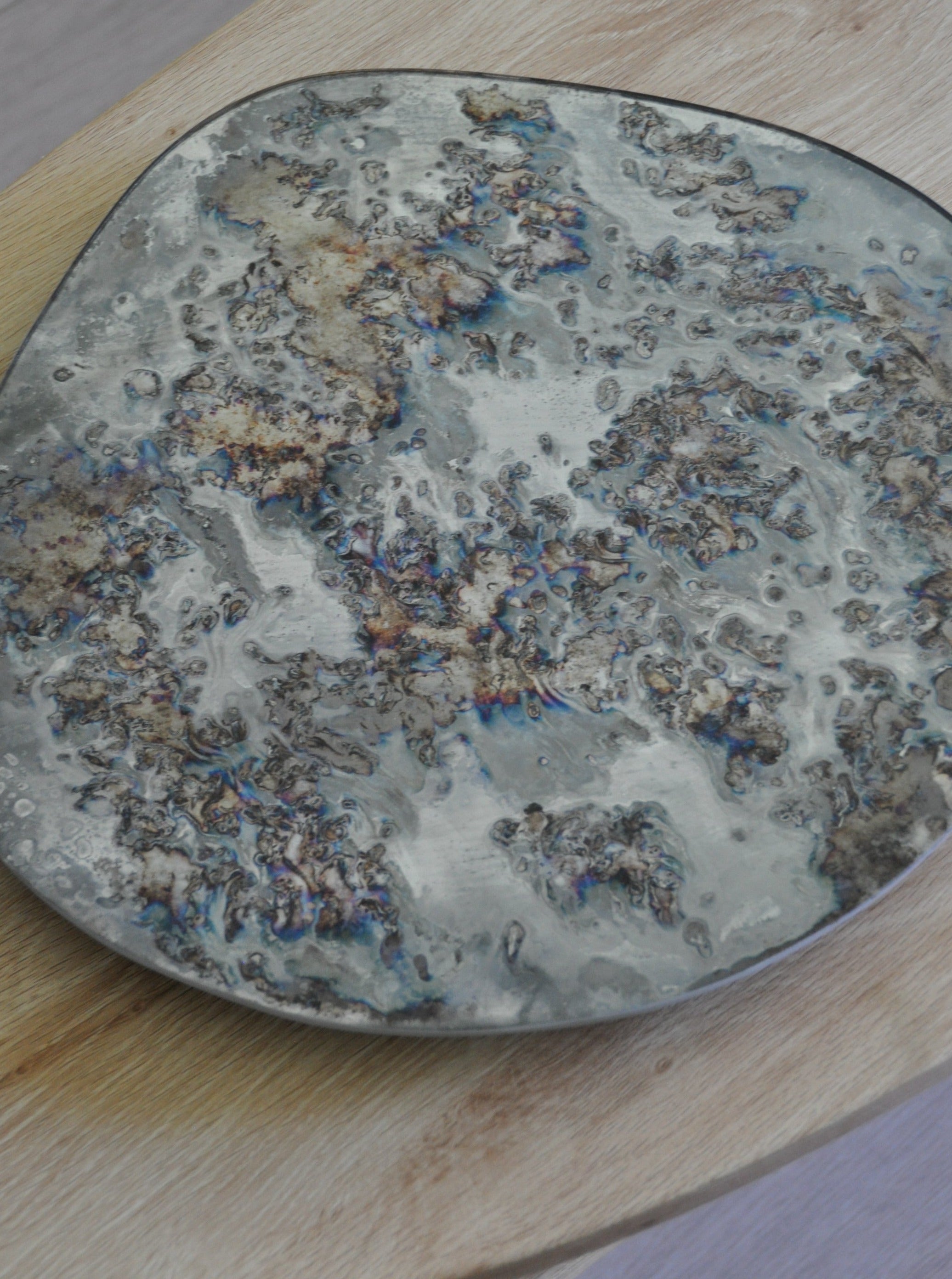 Tamaño: 38 x 38 cm. Cristal con tratamiento químicos elaborado de forma artesanal, con bordes pulido y sellados. Posee anclajes en aluminio en su reverso que le permiten orientarlo en dos posiciones. Su tratamiento permite reflejarse completamente. No se aconseja para decoración al exterior (aire libre). Cada pieza queda única en su tratamiento; color y tipo de mancha.