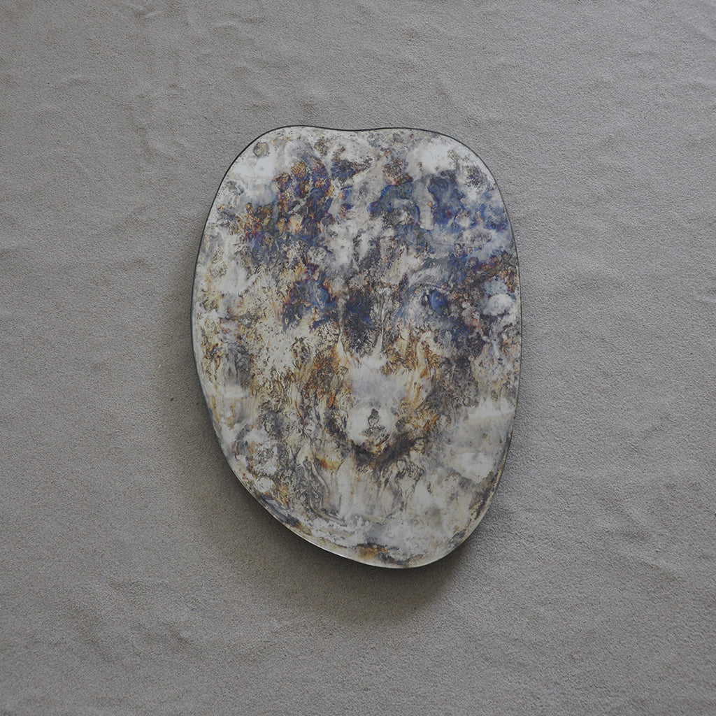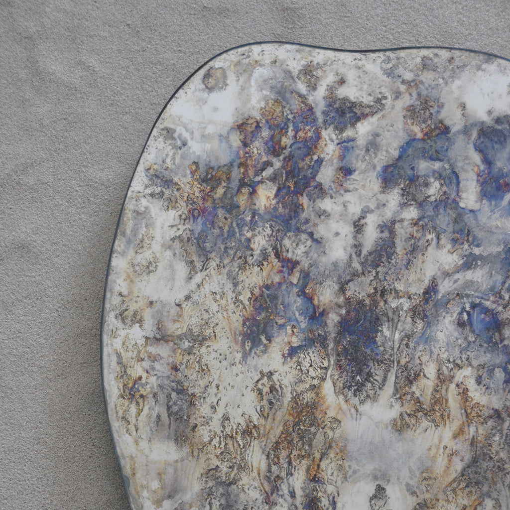 Tamaño: 38 x 54 cm. Cristal con tratamiento químicos elaborado de forma artesanal, con bordes pulido y sellados. Posee anclajes en aluminio en su reverso que le permiten orientarlo en dos posiciones. Su tratamiento permite reflejarse completamente.No se aconseja para decoración al exterior (aire libre). Cada pieza queda única en su tratamiento; color y tipo de mancha.