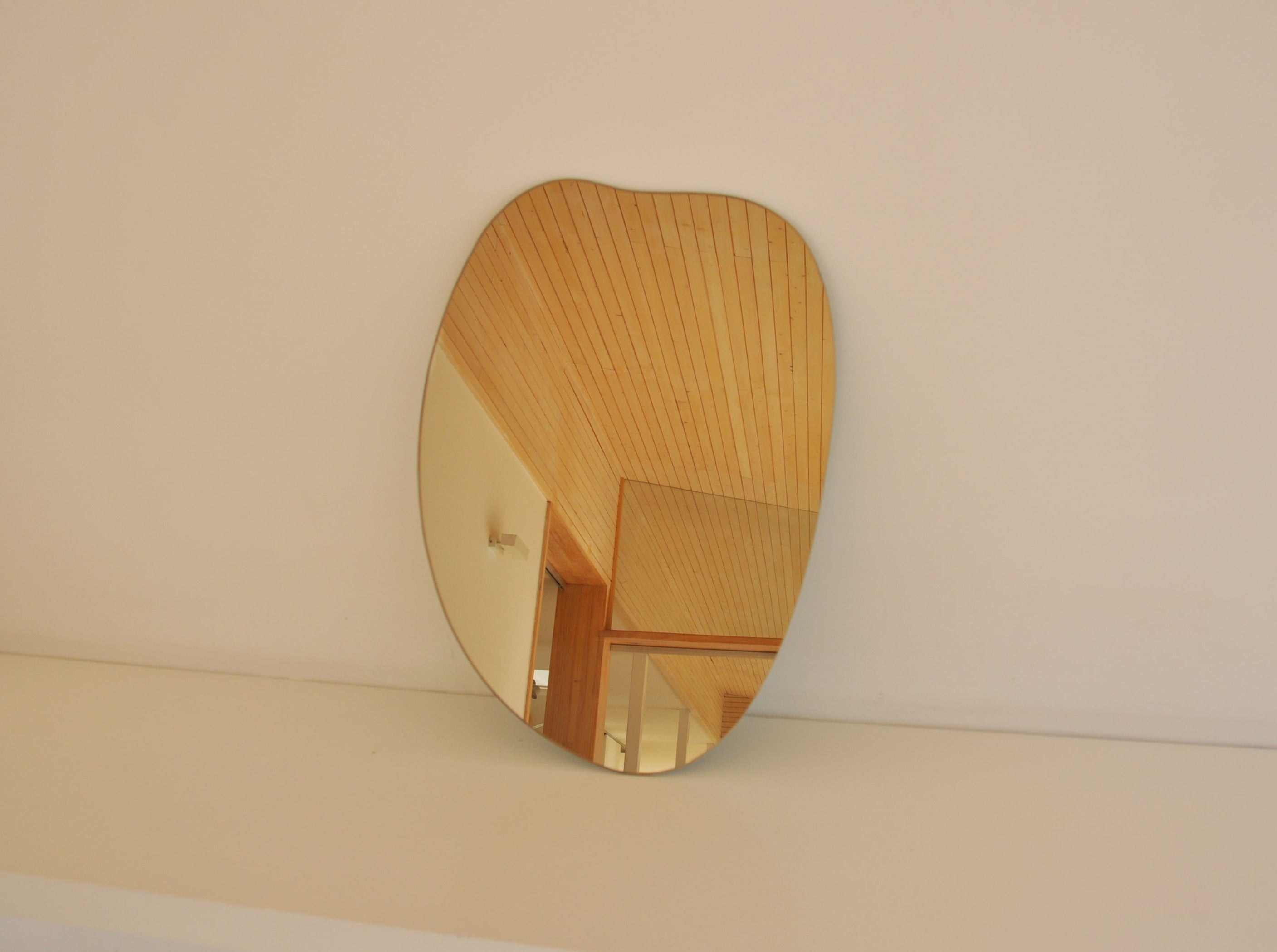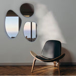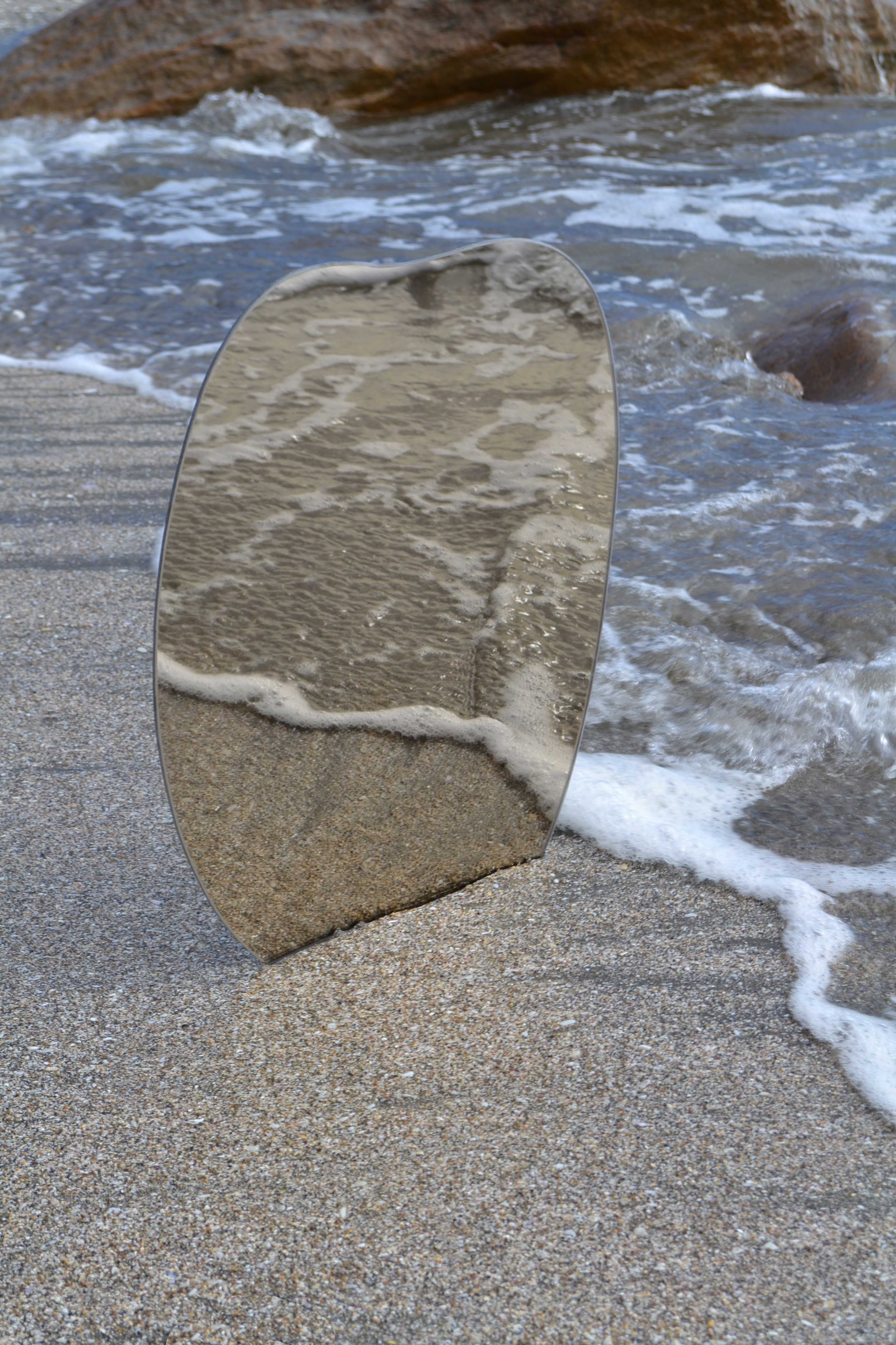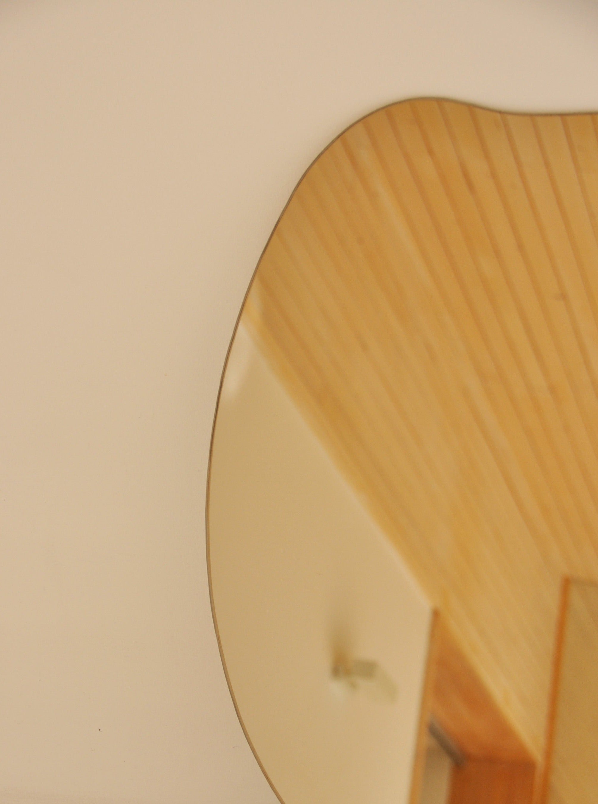 Espejo certificado calidad belga espesor 4mm, con bordes pulidos y sellado con líquido protector. Posee anclajes en aluminio en su reverso que le permiten orientarlo en dos posiciones. El tono del espejo es un tono bronce muy sutil, dependiendo de la luz del lugar se identifica.